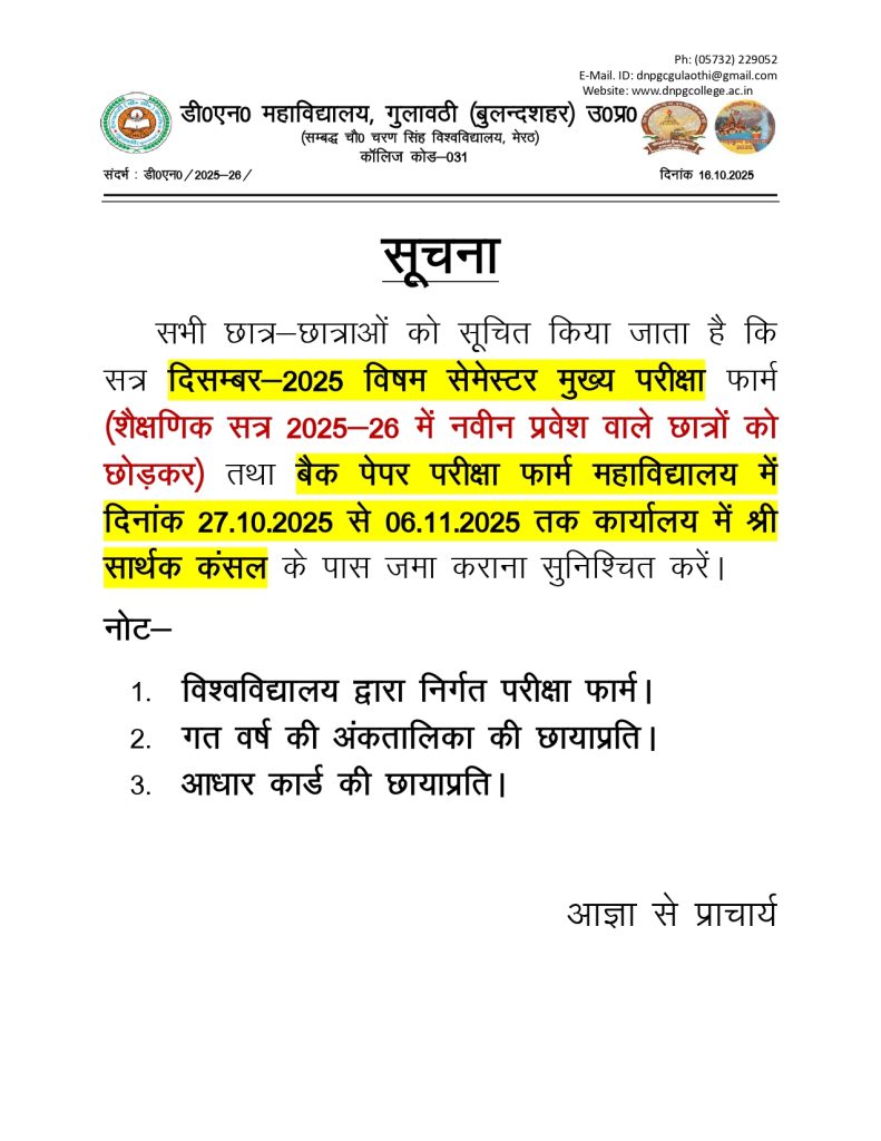 सत्र दिसम्बर-2025 विषम सेमेस्टर मुख्य परीक्षा फार्म तथा बैक पेपर परीक्षा फार्म सम्बंधी नोटिस। October 16, 2025 admin