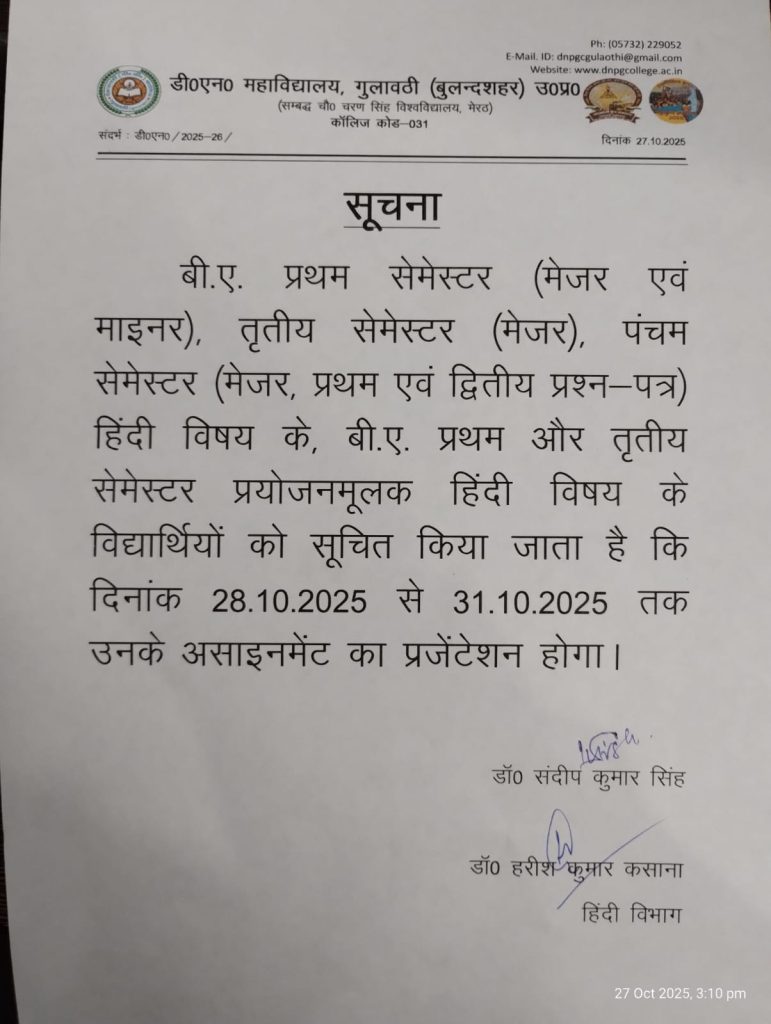 बी.ए. प्रथम सेमेस्टर (मेजर एवं माइनर), तृतीय सेमेस्टर (मेजर), पंचम सेमेस्टर (मेजर, प्रथम एवं द्वितीय प्रश्न-पत्र) हिंदी विषय के, बी.ए. प्रथम और तृतीय सेमेस्टर प्रयोजनमूलक हिंदी विषय के असाइनमेंट एवं प्रजेंटेशन सम्बंधी।