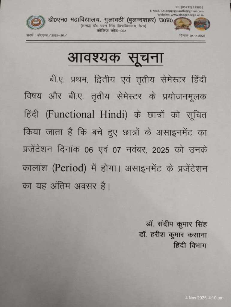 बचे हुए छात्रों के असाइनमेंट का प्रजेंटेशन दिनांक 06 एवं 07 नवंबर, 2025 को उनके कालांश (Period) में होगा। असाइनमेंट के प्रजेंटेशन का यह अंतिम अवसर है।