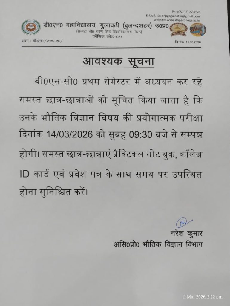 बी0ए0/बी0एस-सी0 सम सेमेस्टर (द्वितीय, चतुर्थ एवं षष्ठ) के विद्यार्थियों की कक्षाएं दिनांक 19.03.2026 को स्थगित होने के सम्बंध में।